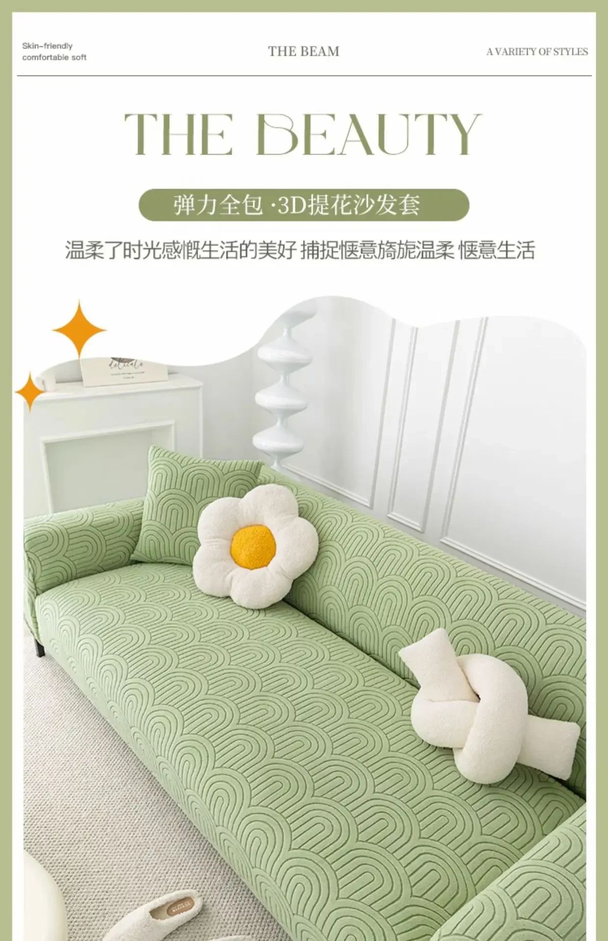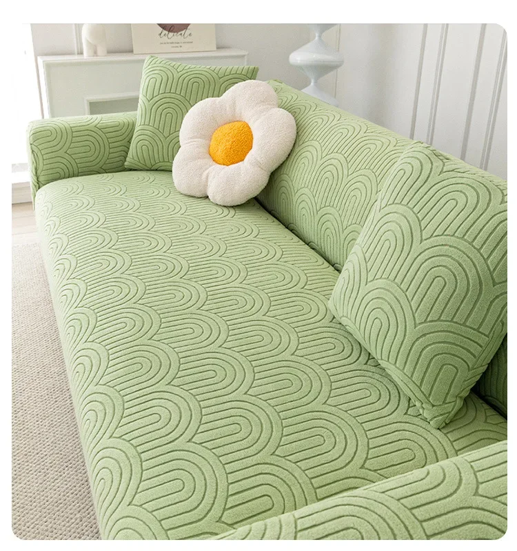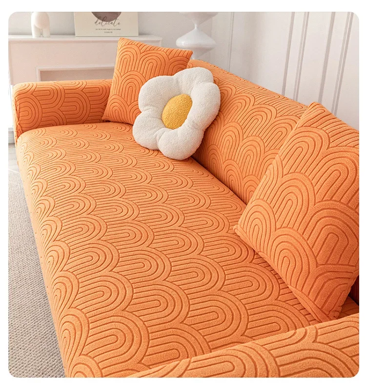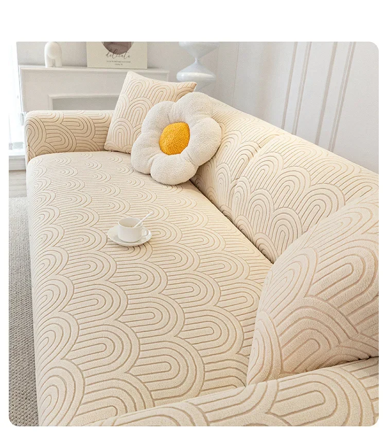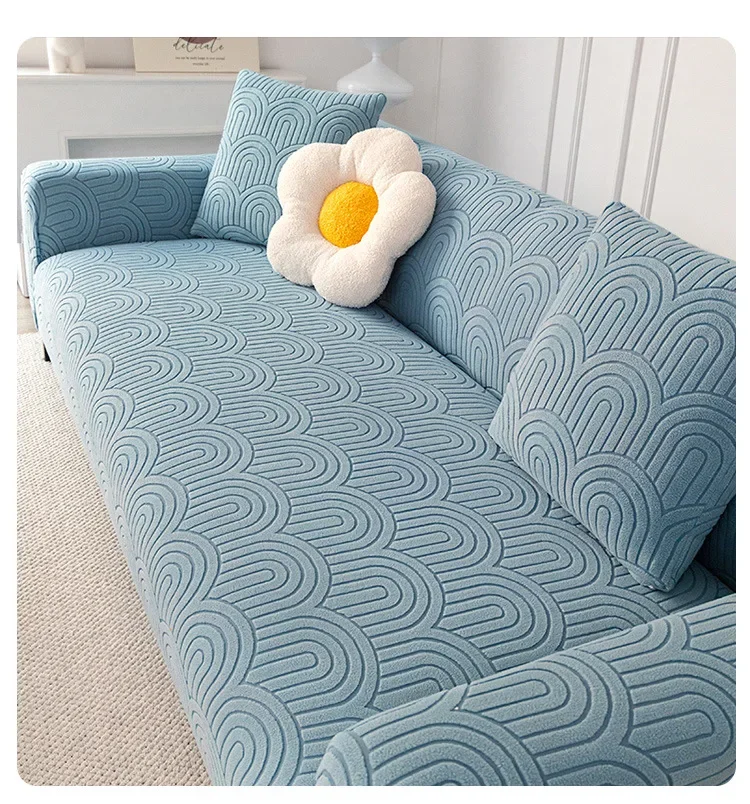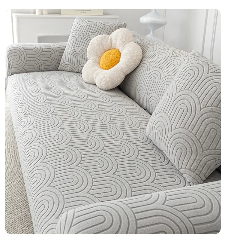 This stretch sofa slipcover features a modern geometric wave pattern with a textured finish. Made from soft, elastic fabric, it provides a snug fit and protects against spills, stains, and pet scratches. Its stylish design enhances any living space, making it perfect for refreshing old furniture or safeguarding new pieces.