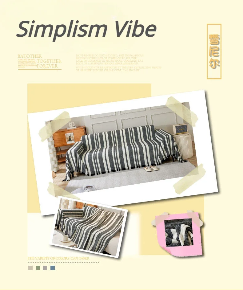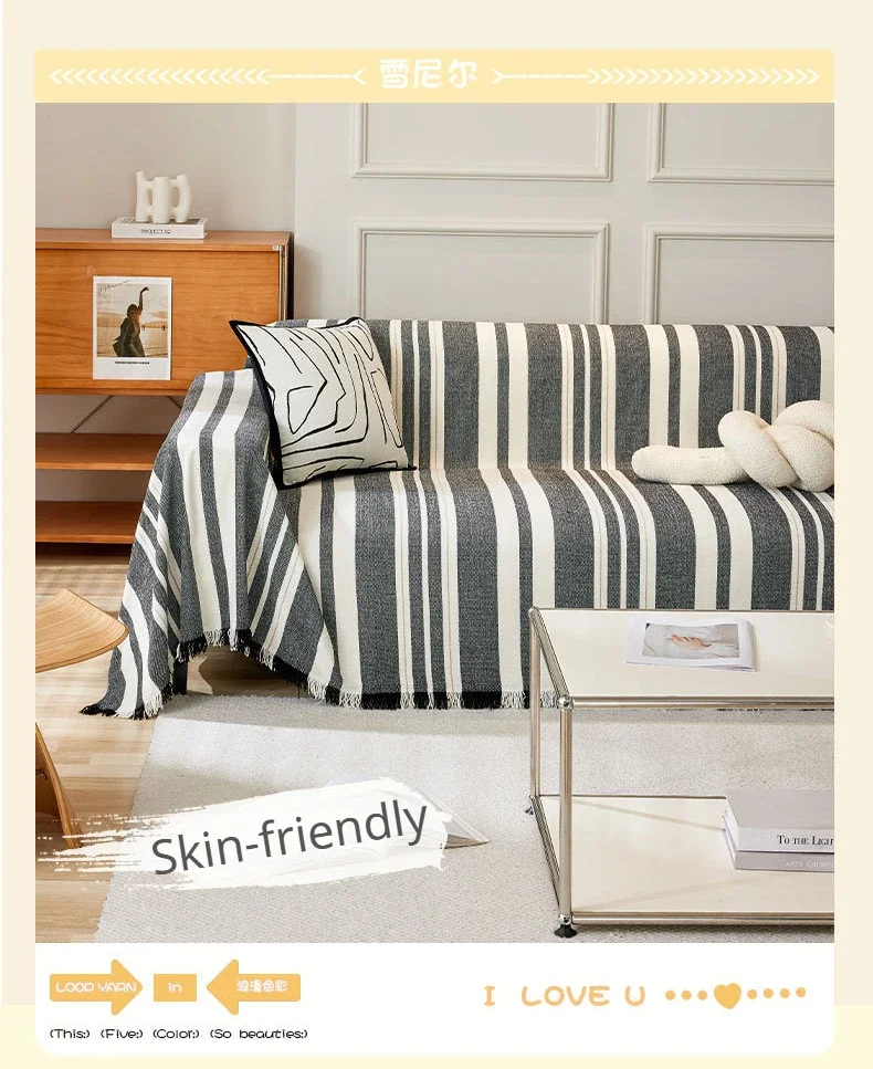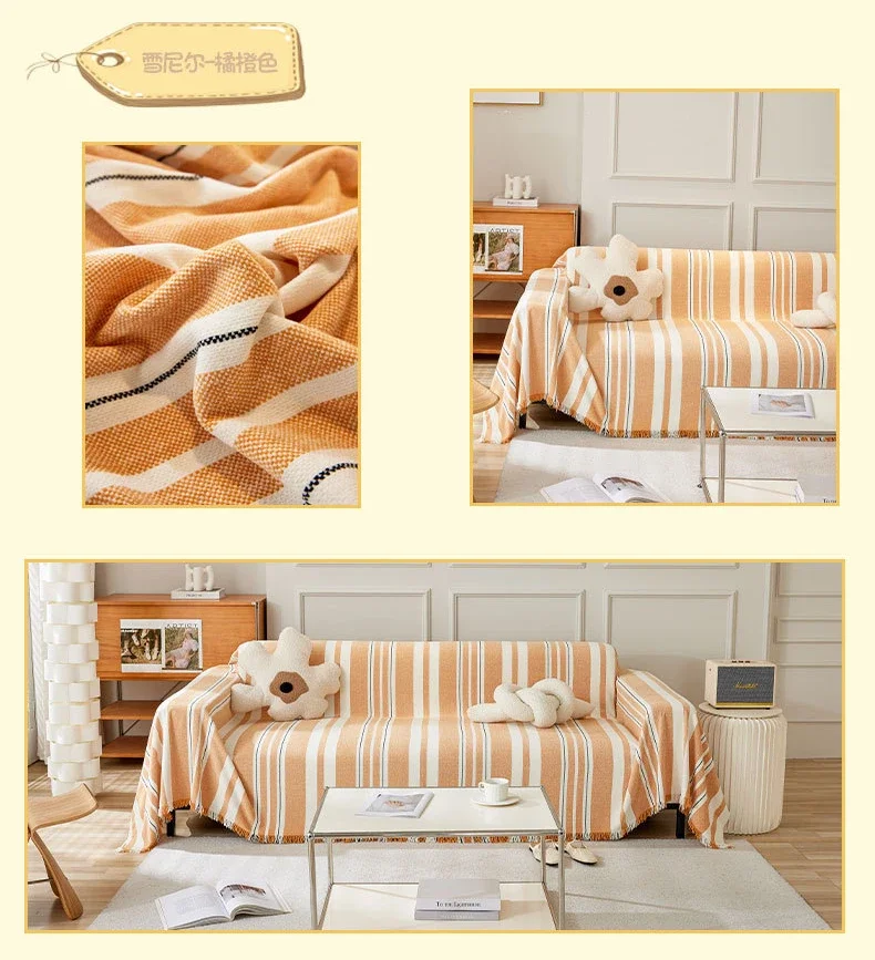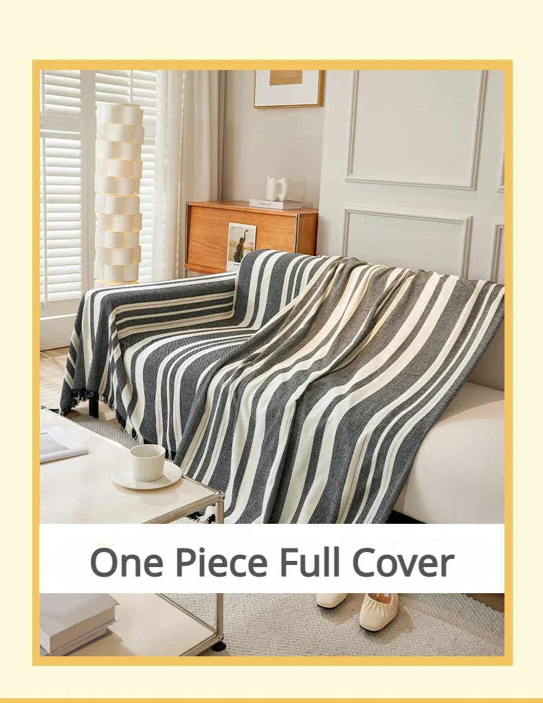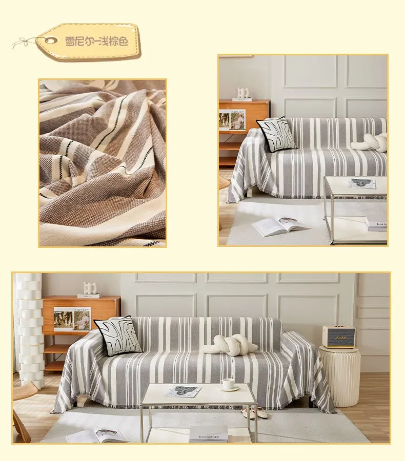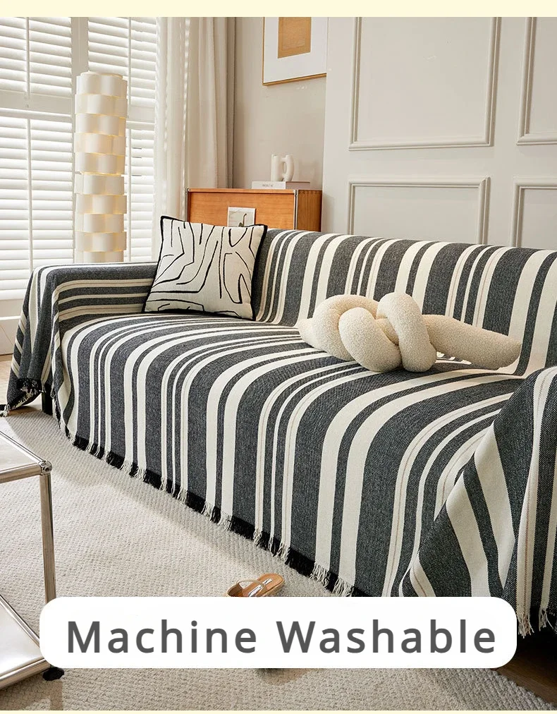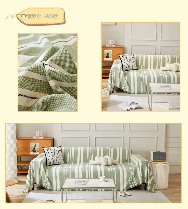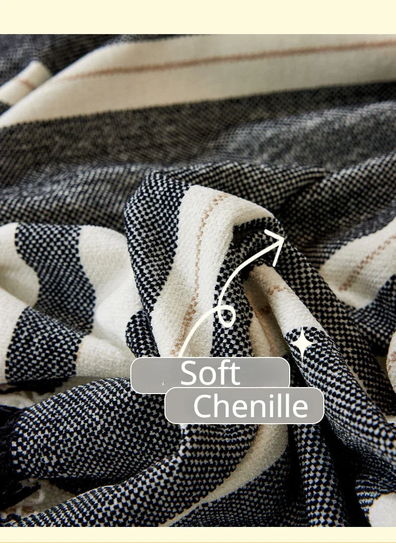 This chenille striped sofa cover features a jacquard weave with clear, orderly striped patterns for a refined texture. Soft and comfortable year-round, it easily drapes over seats, backs, and armrests. Finished with clean edges and decorative fringe, it protects furniture from dust, pet hair, and wear. Also usable as a throw or tablecloth. Machine washable for easy care.